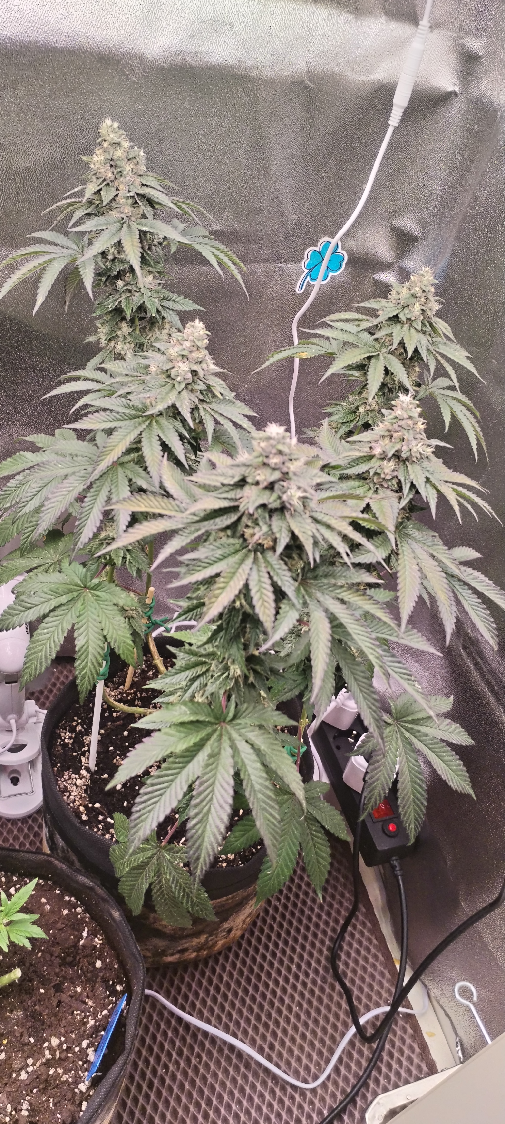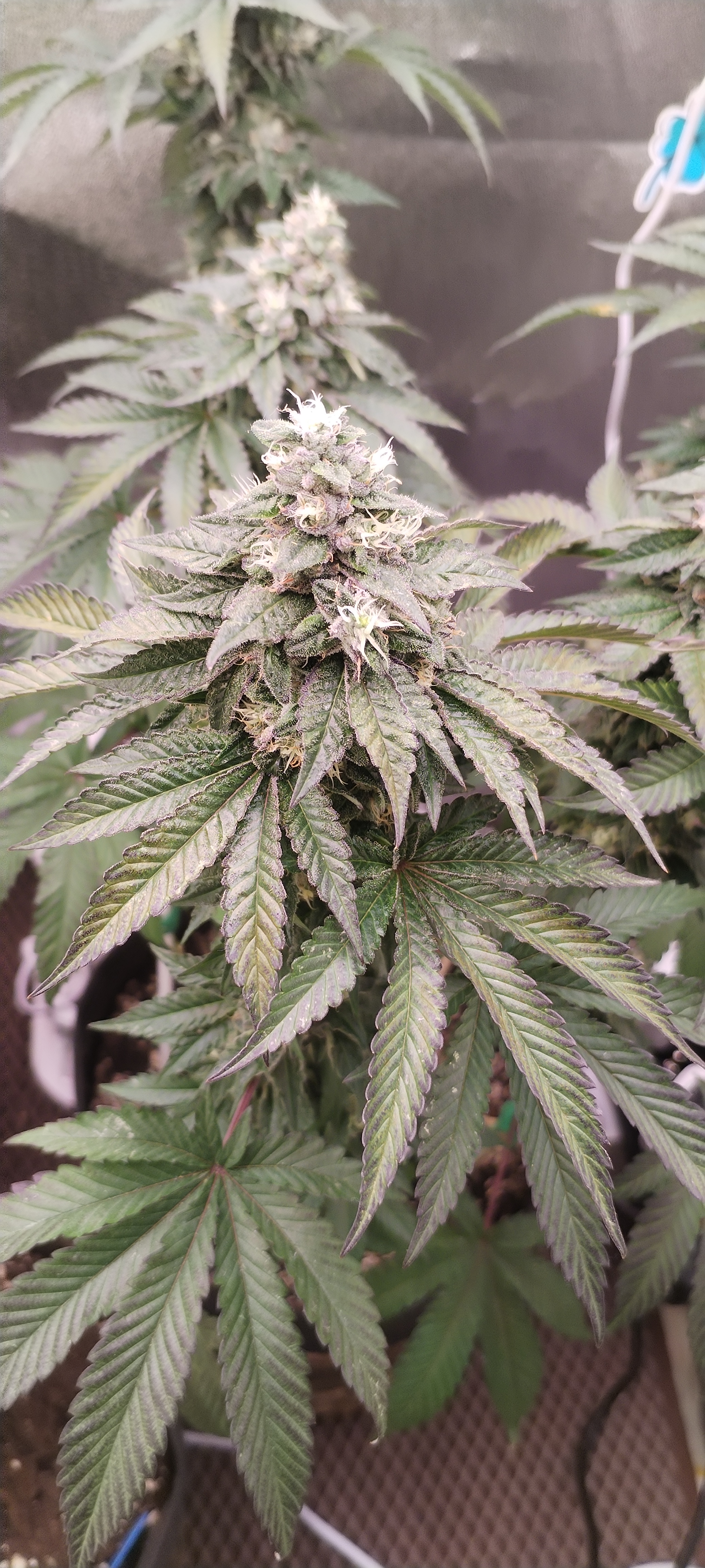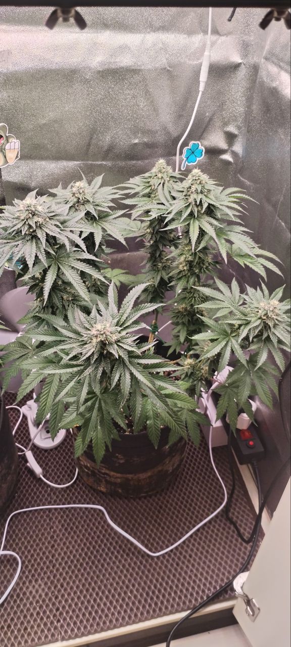 Куст под "Мейнлинингом" (самая жёсткая тренировка), кто не знал. Очень стрессоусточивый, крепкий, очень много листвы, вся темно-зелёная! Сильный сорт!! Дефолиацию постоянно проводил, очень липкий сахарный, на цветении прожорлив, любит удобрения, меры не знает, передоз не ловит! Со временем цвет листьев начал принимать фиолетовый оттенок. Сейчас вообще зрелизная, фото не передаст. Ещё не харвнул, цветёт! Изначально было сформирован но 8 кол, но аппетит взял своё! Эффект бомбический, каждый раз разматывает!